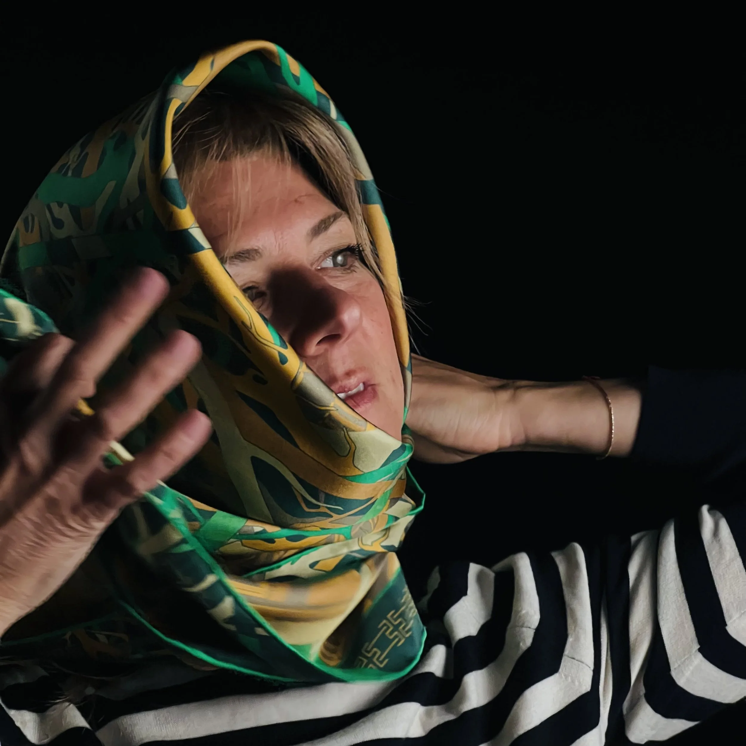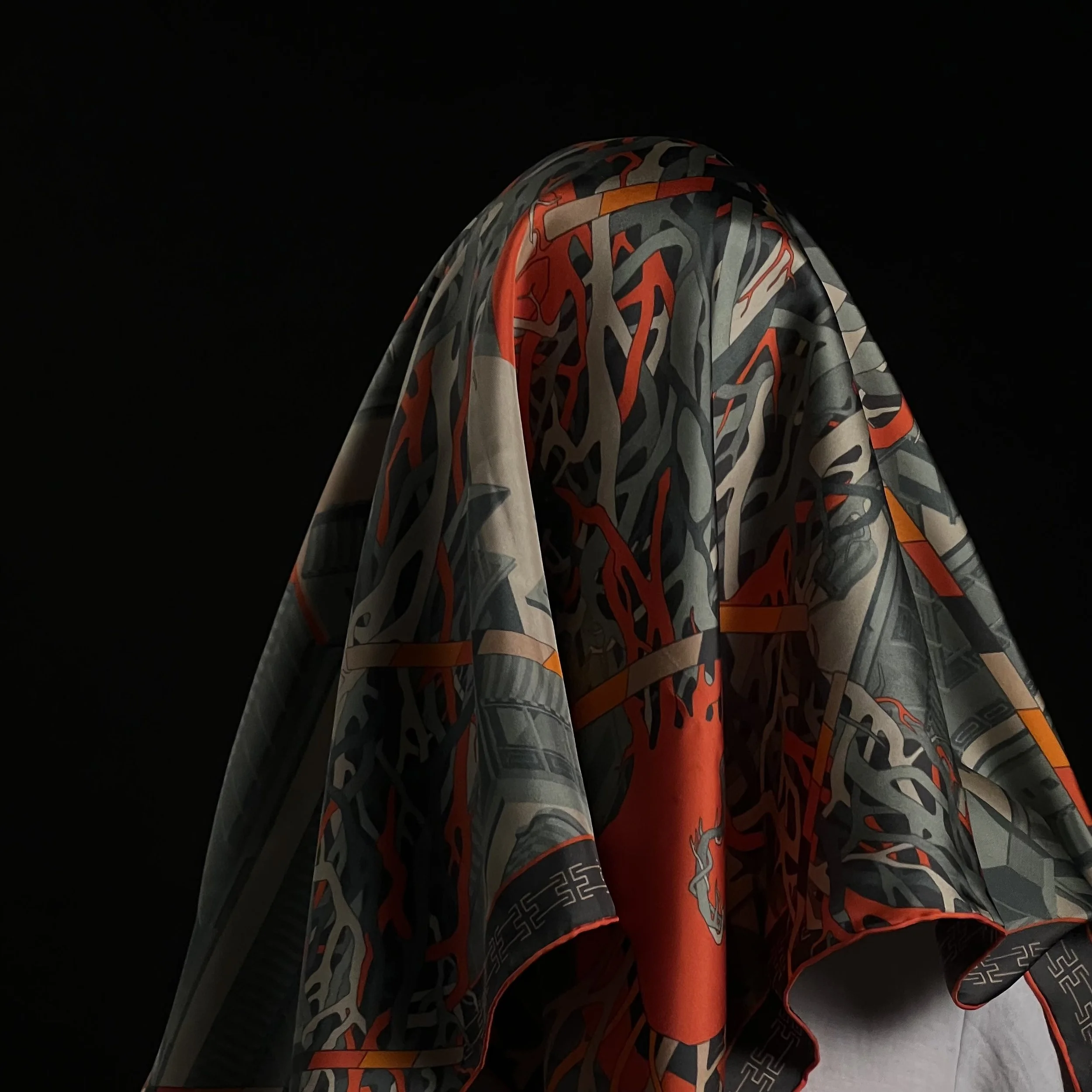 THESE DESIGNS 这些图案 BLUR THE LINE 混合了 BETWEEN TECHNOLOGY AND REALITY 科技和我们苍凉的现实. EACH SILK SCARF TAKES INSPIRATION 每个丝巾设计来自于欧和中 FROM EAST AND WEST CULTURES, 东和西的文化, WITH STORIES THAT QUESTION OUR BELIEFS 用故事来质疑